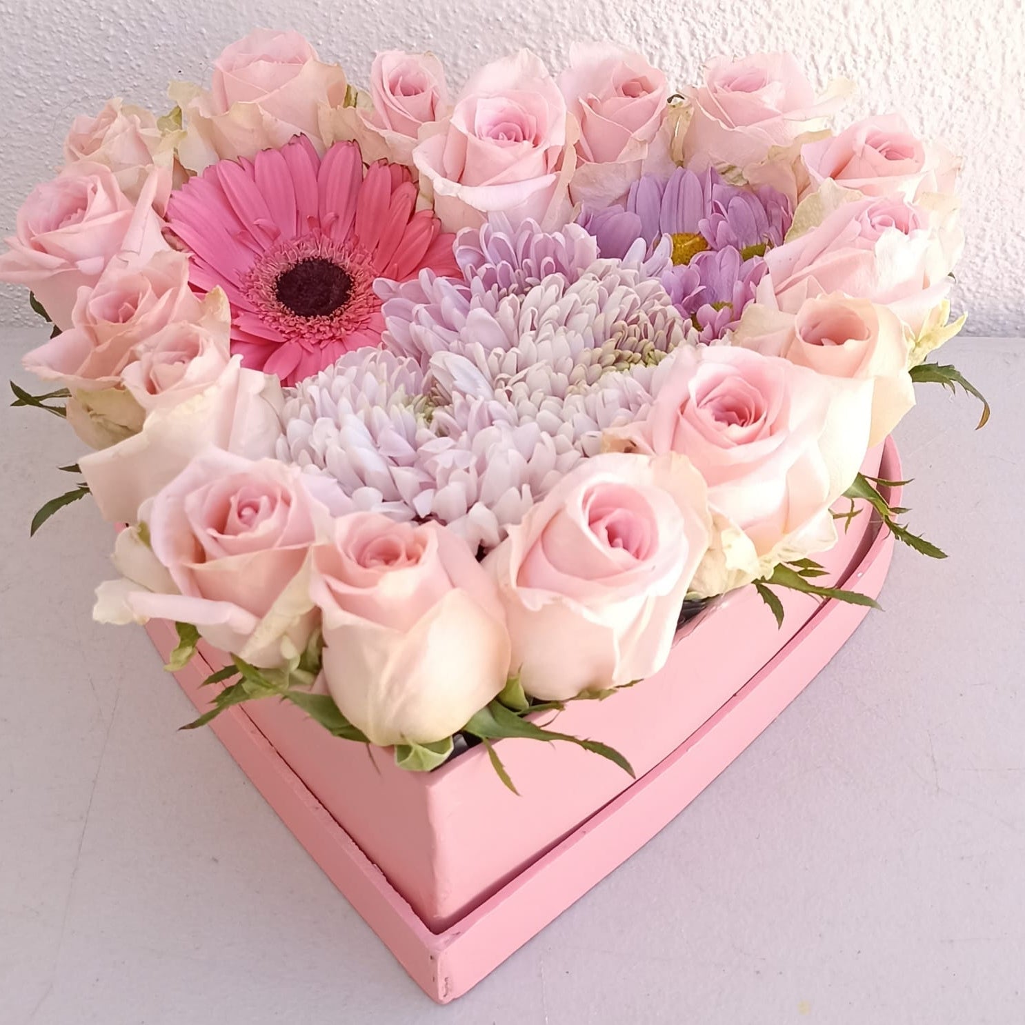 Una hermosa caja en forma de corazón, revestida en un suave tono rosa pastel. Las rosas rosadas, símbolo eterno del cariño y la dulzura, se entrelazan con gerberas del mismo tono, que aportan frescura y alegría con su forma radiante. Entre ellas, destacan las roxanas moradas, añadiendo profundidad, elegancia y un toque de misterio al conjunto.