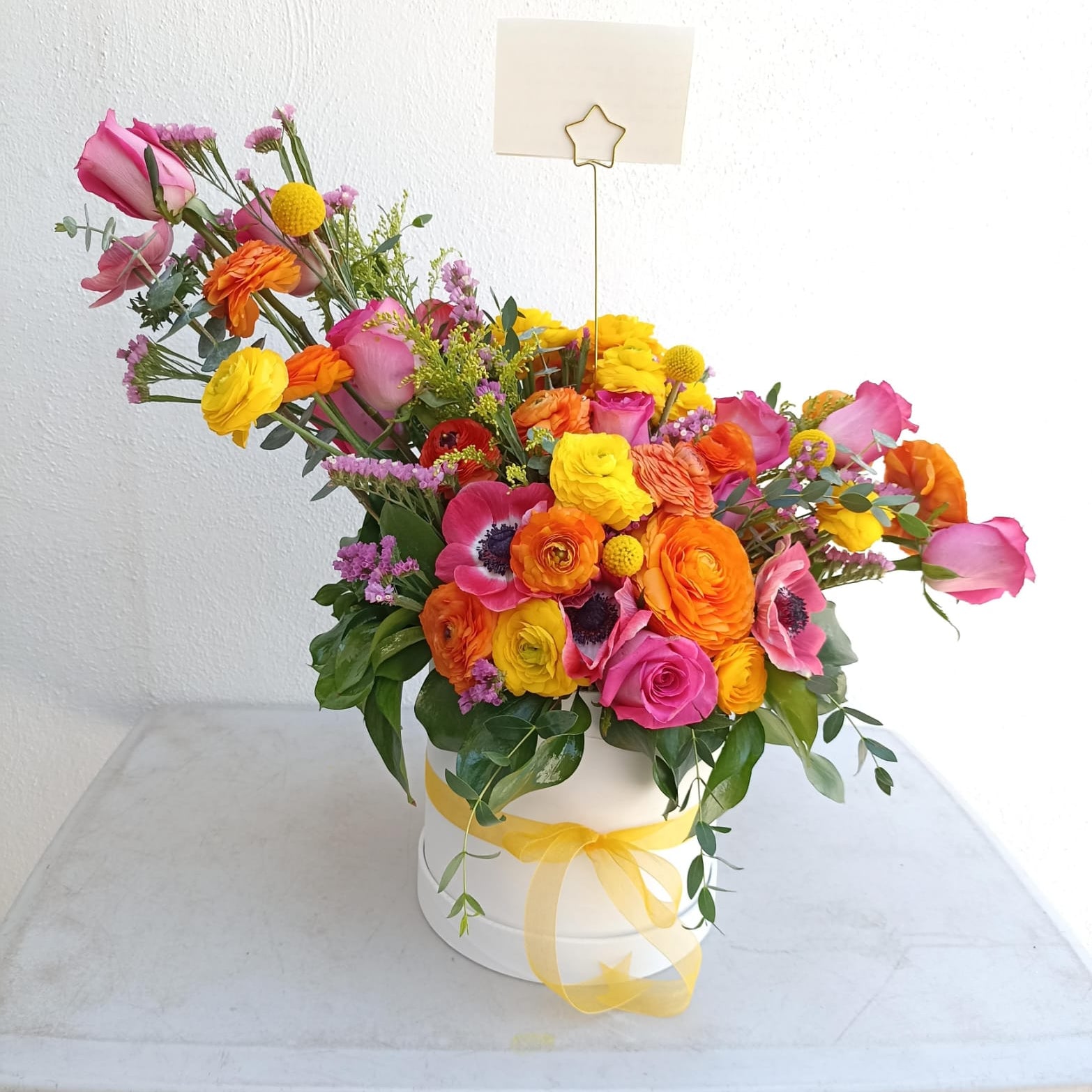Una caja blanca de forma circular y elegante, guarda en su interior un pequeño jardín lleno de vida. Los ranúnculos en tonos naranja y amarillo despliegan sus capas como pequeñas explosiones de luz, irradiando energía y alegría. A su lado, las delicadas anémonas rosadas contrastan suavemente, aportando un toque romántico y sutil, con sus centros oscuros que realzan su belleza única.