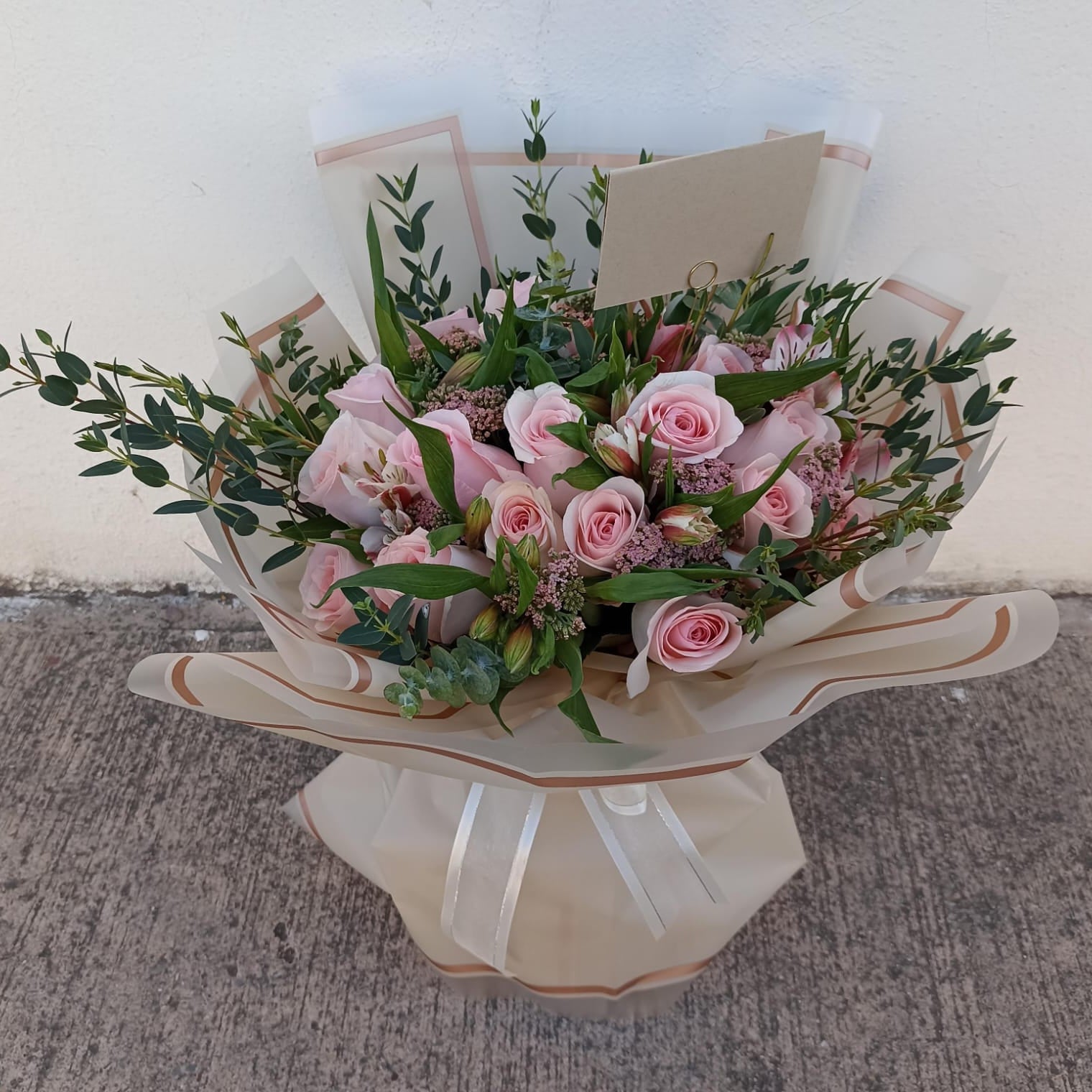 Un encantador bouquet compuesto por rosas en tonos rosa suave, símbolo de ternura, amor sincero y admiración. Las flores, frescas y perfectamente abiertas, están acompañadas por follaje verde natural que realza su color y aporta un contraste fresco y armonioso.
