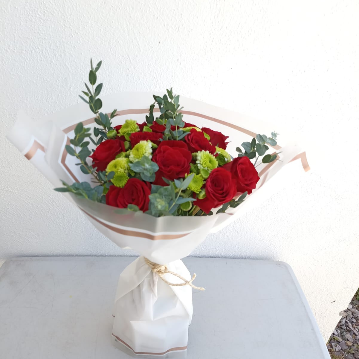 Un bouquet vibrante y lleno de carácter, compuesto por rosas rojas intensas, símbolo eterno del amor, la pasión y la entrega sincera. Estas flores majestuosas se acompañan de yoko verde, con sus pequeños pompones alegres. El follaje verde natural enmarca todo el arreglo, dándole volumen, movimiento y una sensación de frescura viva.