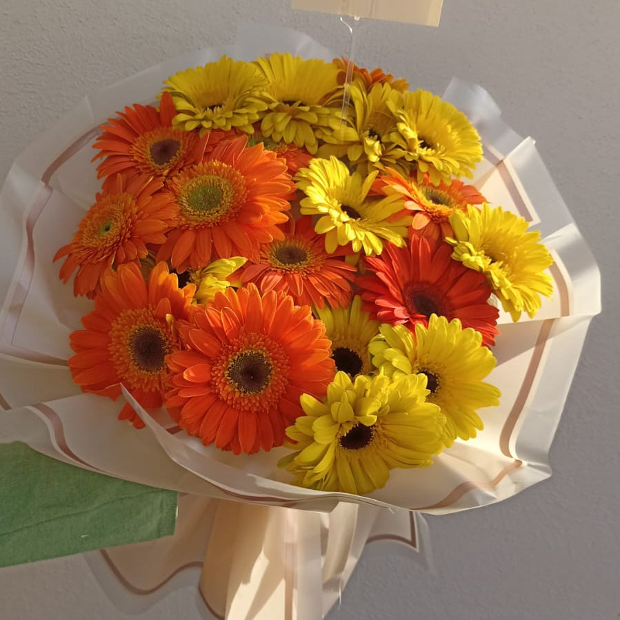 Llena de energía y alegría cualquier momento con este bouquet luminoso de gerberas amarillas y naranjas, flores que irradian vitalidad, optimismo y calidez. Su forma radiante y colores vibrantes hacen de este arreglo una opción perfecta para celebrar la vida, agradecer con una sonrisa o simplemente alegrar el día de alguien especial.